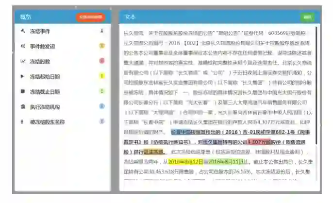 分析完以后,找到主句,然后再上下文补齐,例如图片中的例子中整篇公告描述的是一个冻结的事件,但是主句子只描述了4个角色,而完整的冻结事件至少要提取6个角色,主句中缺乏的是起始和结束时间,这两个元素需要从别的句子当中补齐,最终结果如demo页面2所示。