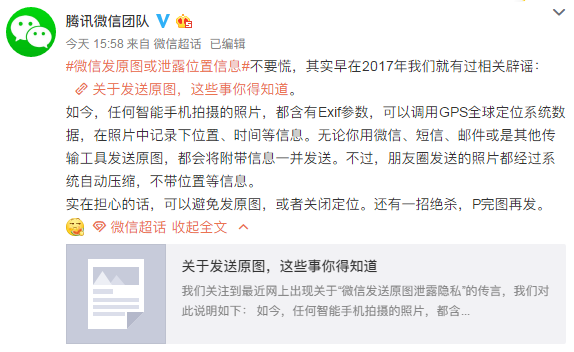 针对微信发原图或泄露位置信息的传闻,微信方面回应称,任何智能手机拍摄的照片都含有Exif参数,可以调用GPS数据,在照片中记录下位置、时间等信息。