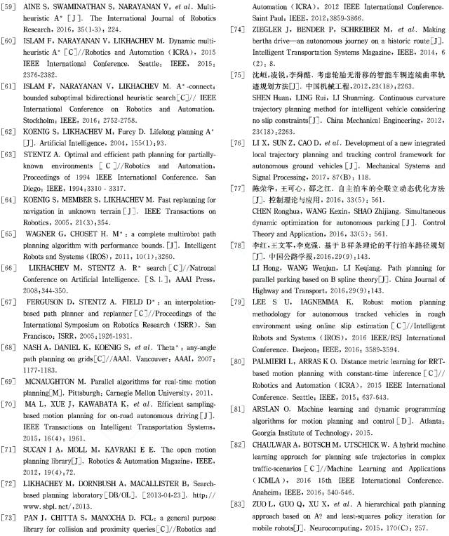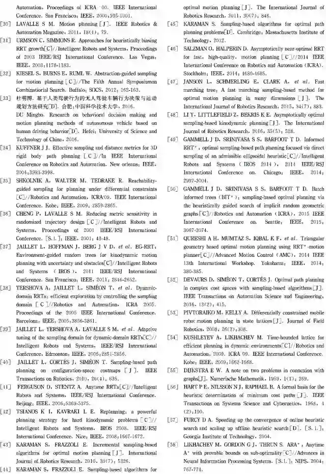 本文总结了目前文献中经常出现的各种适用于无人车运动规划的算法,分别从理论、算法实时性等方面分析比较了它们在理论上的优势和缺点,为今后的深人研究提供参考。