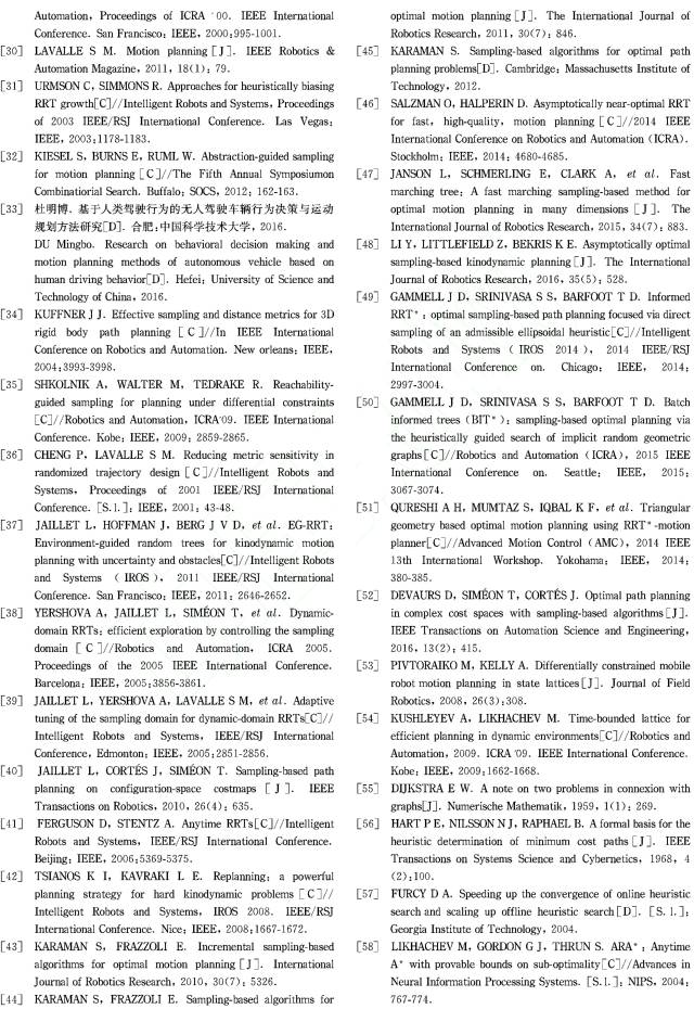 运动规划是与机器人、人工智能和控制理论等学科息息相关的一个研究领域,其任务是规划出驱使机器人从当前位置运动到目标位置的一系列指令 [1]。随着智能汽车的兴起,以无人车为研究对象的运动规划问题越来越受到重视。