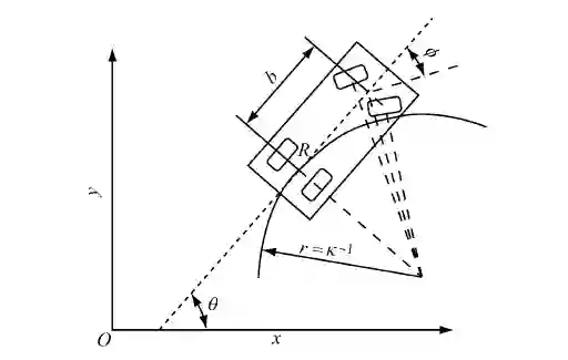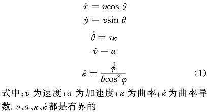 运动规划所采用的车辆模型具有微分平坦性质,其平坦输出为后轴中心 R 的坐标。因此,轨迹生成就是要构造 R 的一条足够光滑且满足各种有界性的轨迹来连接两个给定状态。