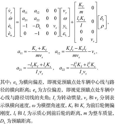 目前最常用的是具有阿克曼转向性质的车辆模型。该模型将车辆视为平面刚体,具有 3 个自由度,构形空间 C 为二维特殊欧式群 SE(2),选取后轴中心 R 作为参考点。如图 2 中,车辆(轴距为 b)在大地坐标系下的坐标为(x,y),航向角为 θ,那么车辆位置唯一确定。另外,在转向时,在方向盘转角为 Φ 的情况下,车辆转向路径的半径 r 和曲率 κ 分别如图 2 所示。车辆的状态方程见式(1)。