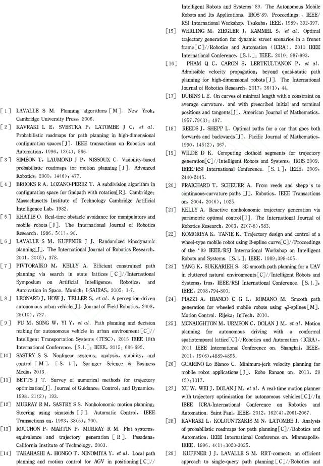 Dubins 曲线 [17] 和 Reeds and Shepp(RS)曲线 [18] 是连接构形空间中任意两点的最短路径,分别对应无倒车和有倒车的情况。它们都是由最大曲率圆弧和直线组成的,在圆弧和直线连接处存在曲率不连续,实际车辆按照这样曲线行驶时必须在曲率不连续处停车调整方向轮才能继续行驶。