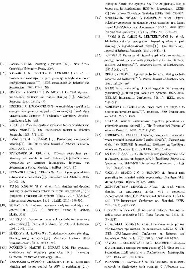 论文回顾了无人驾驶汽车的运动规划问题,其运动受微分约束,且运行环境既包括结构化的道路也包括非结构化的旷野。根据具有阿克曼转向性质的车辆模型所具有的微分平坦性质,可以简化无人驾驶汽车的轨迹生成问题。此外,相比直接轨迹生成法,路径-速度分解法更常用,回旋线、样条曲线、多项式螺旋线是使用较多的路径生成曲线。