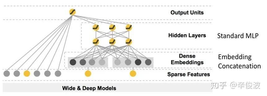 深度加宽度的模型范式,本身并不是一个具体的模型,wide和deep部分可以用任意结构框架,wide的baseline是LR模型;deep的baseline是MLP模型。