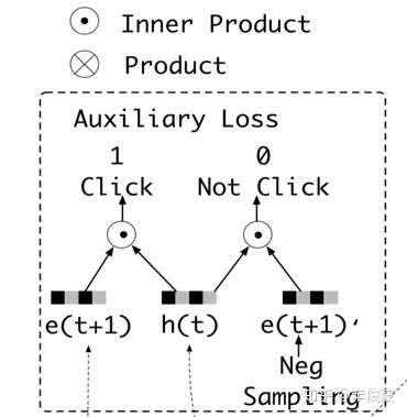 其中a为超参数,代表的是辅助loss对整体loss的贡献。有了这个辅助loss,t时刻提取的隐层向量h(t)可以比原始的h(t)更有助于表达用户兴趣,也可以加速网络的训练过程。