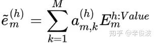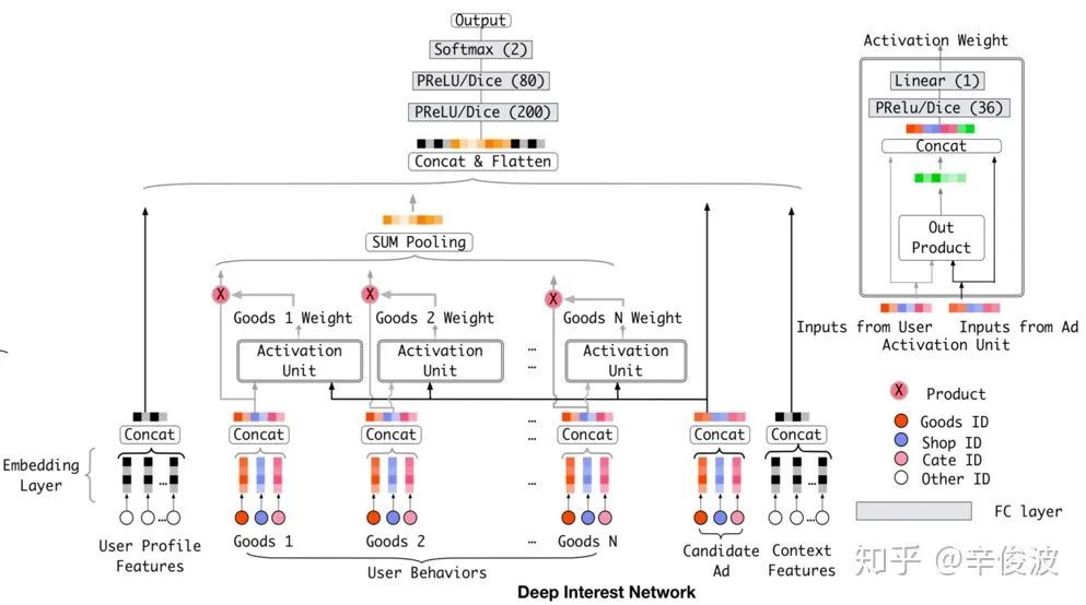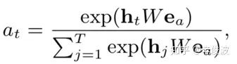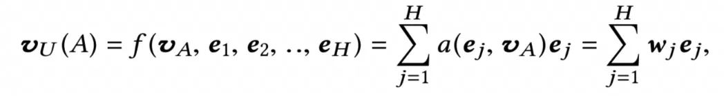对于每个历史行为ht,当前候选广告ea,通过softmax求出两者的权重。注意这里不是直接向量点击,而是引入了矩阵W,可以认为是简单的一层全连接网络。