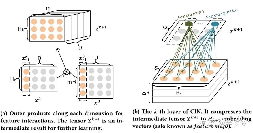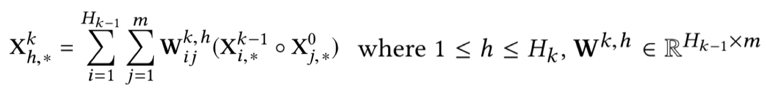 使用CIN模型来提取特征交叉。和DCN模型一样的是,这里也使用了多层的cross,每一层的输入也是由第一层和上一层的输入组成,不同的是,xdeepFM模型的特征交叉是vector wise层级的,而DCN模型是bit-wise的