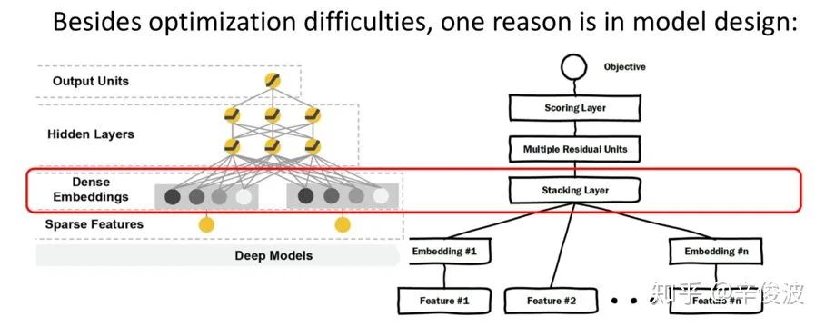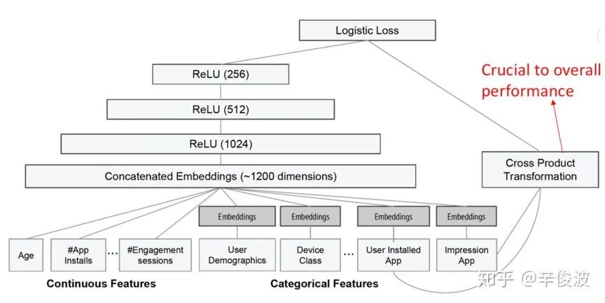 和wide&deep最大的不同是deep部分引用了res-net,但个人觉得在目前主流的模型里用的较少。虽然res-net理论上可以使用更深的模型提升效果,但在目前工业界大规模稀疏的推荐系统里,还没见到太多往res-net方向取得较大进展的工作。