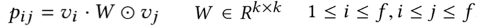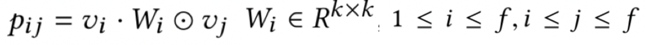 交叉使用的带权重的bi-interaction,可以理解成所有vector的weight sum pooling,然后使用一个简单的线性模型得到最终的值