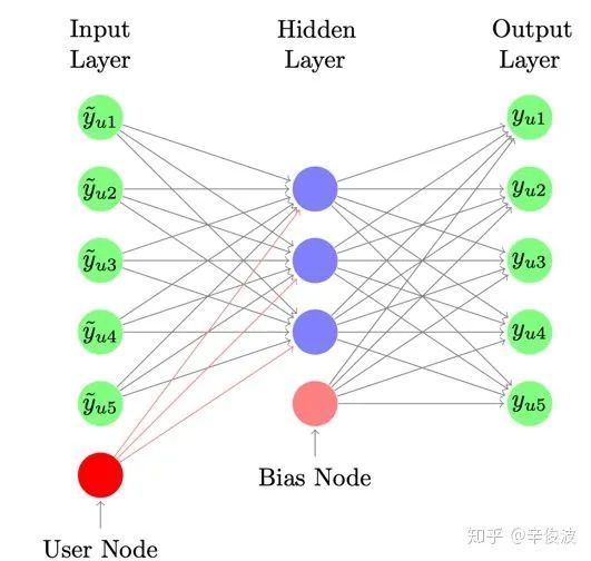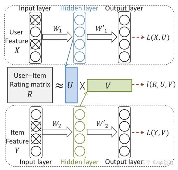 和DMF一样,user用user作用过的item集合表示,item则用itemid本身表示,图中在原slides是说user-autoencoder,但个人在看原始autoRec论文时,这块应该有误,应该是item-based的,因为m表示的是用户数,n表示item数,下方的输入表示所有user(1,2,3,…m)对item i的交互输入