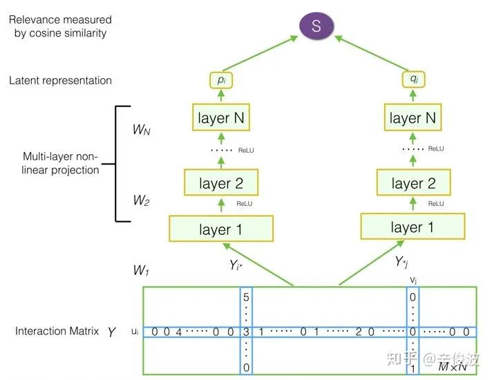 DMF模型也就是深度矩阵分解模型,在传统的MF中增加了MLP网络,整个网络框架如图3.3所示。