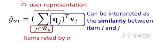 注意到用户表达不再是独立的隐向量,而是用用户喜欢过的所有item的累加求和得到作为user的表达;而item本身的隐向量vi是另一套表示,两者最终同样用向量内积表示。