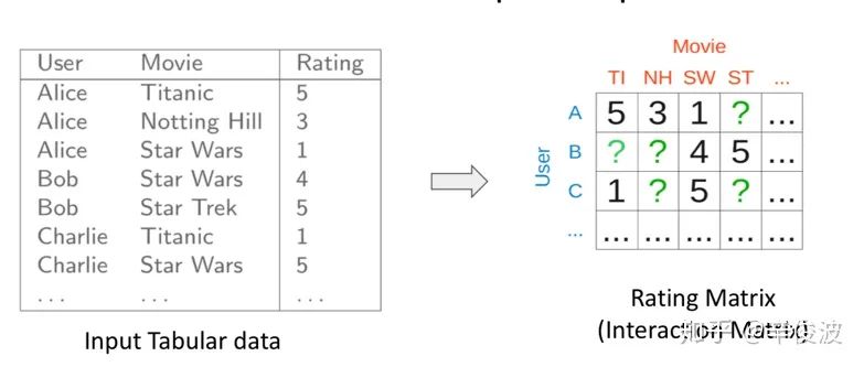 CF协同过滤的思路要解决的问题用数据形式表达就是:矩阵的未知部分如何填充问题(Matrix Completion)。如图2.1所示,已知的值是用户已经交互过的item,如何基于这些已知值填充矩阵剩下的未知值,也就是去预测用户没有交互过的item是矩阵填充要解决的问题。
