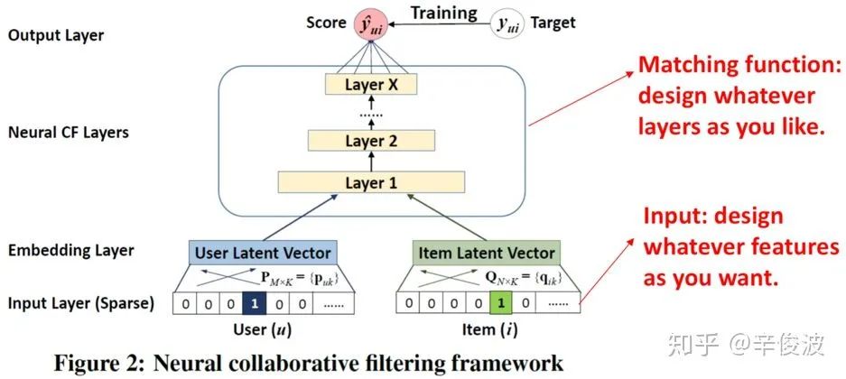 (2)用户u和物品i的向量点积(inner product)得到的value,可以用来代表用户u对物品i的喜好程度,分数越高代表该item推荐给用户的概率就越大