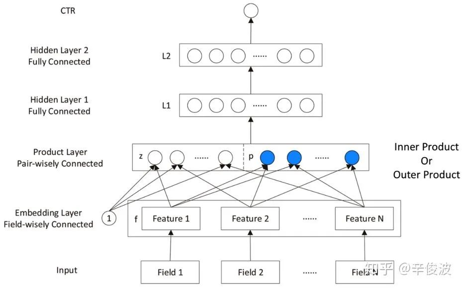 PNN模型放到基于FM的模型是因为本质上和FM一样,都是在学习特征的二阶组合。和deepFM不同的是,以IPNN为例,PNN的所有特征两两product交叉学习得到的值conat后得到现实的product vector后进入MLP模型;而deepFM是直接将FM模型的vector输入到MLP模型中。
