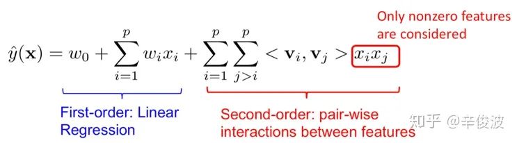 注意红色部分表示的是二阶特征的两两组合(特征自己和自己不做交叉),向量之间的交叉还是用向量内积表示。FM模型是feature-based模型的一个范式表达,接下来介绍的几个模型都可以看成是FM模型的特殊范例。