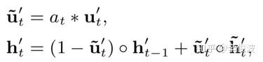 这里作者使用了attention权重at来取代原始GRU中的更新门,表达如下