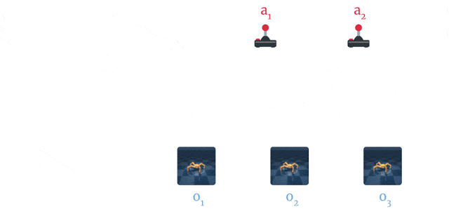 Dreamer 从经验中学习世界模型。它使用过去的图像(o1-o3)和行为(a1-a2),计算一系列密集的模型状态(绿色圆圈),从中重建图像(ô1–ô3)并预测奖励(r̂1-r̂3)。