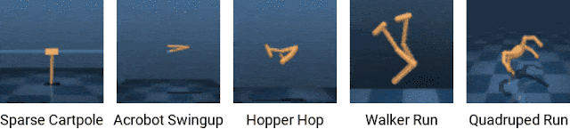 Dreamer 学习解决20个具有挑战性的连续控制任务与图像输入,上图展示了其中 5个任务。可视化显示的图像与智能体从环境接收的64x64图像相同。