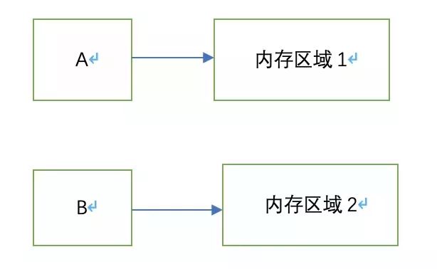 A和B指向的不是同一块内存区域,只是这两块内存区域中的内容是一样的,即为深拷贝。