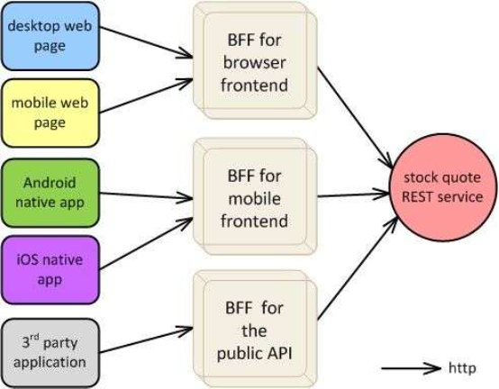 我们当然不可能将同一服务契约(即规范模型)强加给所有类型的服务客户端,而应选择“隔离接口”以确保不同类型的客户端总能匹配它们实际需要的服务接口。但具体要怎么实现?目前最流行的解决方案就是使用 API 网关。这种网关可以实现消息格式转换、消息结构转换、协议桥接、消息路由等功能。还有另一种流行的替代方案,即面向前端的后端(BFF)模式。在这种情况下,我们会为每种类型的客户端设置一个 API 网关——也就是让每个客户端拥有不同的 BFF,如下图所示。