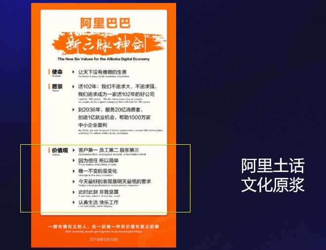 在今年,阿里核心价价值观升级,阿里在讨论新价值观的时候,有一个很有意思的细节,最开始大家按照传统企业文化共创的过程,不停抛出关键词,比如包容、创新、担当等等,大家讨论的时候觉得这些东西不仅仅是我们有,好像别人都有,怎么能够把我们不一样的地方凸显出来?