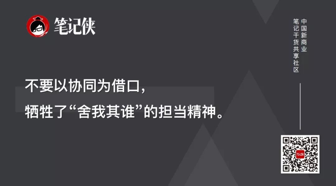 这里引用阿里CEO逍遥子讲的另外一句话。他说,在我看来,没有竞争的团队不是一个好团队,没有杀性的leader不是一个好的leader。说得再直白一点,不要以协同为借口,牺牲了“舍我其谁”的担当精神。