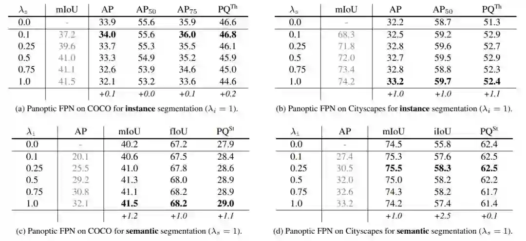 表 2:多任务训练:(a,b) 在单任务基线上增加一个语义分割分支并适当调整λs(加粗部分),能够略微改善实例分割的结果。注意,λs 是指分配给语义分割损失的权重,λs=0.0 作为单任务基线。(c,d) 在单任务基线上增加一个实例分割分支并适当调整λi(加粗部分),能够给语义分割带来更大改善。和之前一样,λi 是指分配给实例分割损失的权重,λi = 0.0 被用作单任务基线。