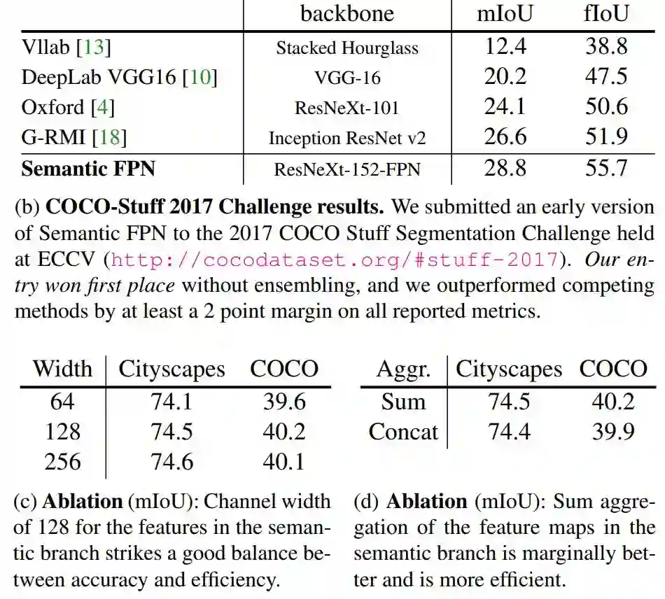 在 2017 年的 COCO Stuff Segmentation 挑战赛中,作者获得第一名时使用的是其模型的初始版本(仅语义分割分支)。然后该单分支模型被采用和泛化至 2018 COCO & Mapillary 挑战赛的几个项目中,充分展示了其灵活性和有效性。作者希望本文提出的联合全景分割基线将同样有效。