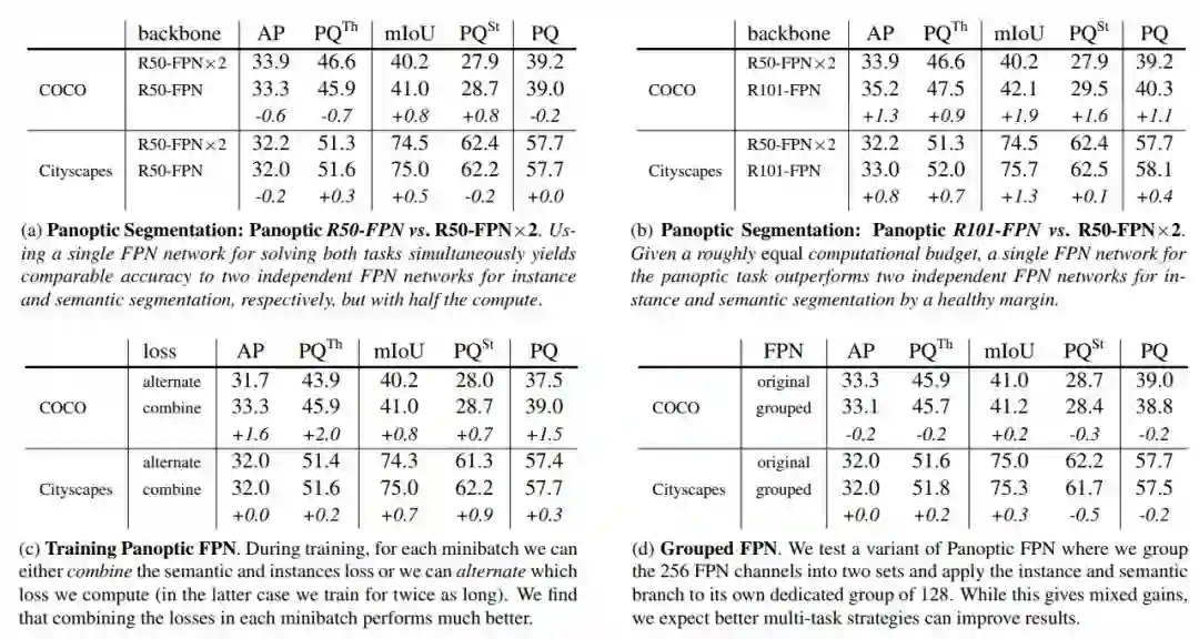 虽然全景 FPN 是 Mask RCNN 利用 FPN 进行的简单扩展,但适当训练两个分支来同时进行基于区域和密集像素的预测对于结果的优劣至关重要。作者在合二为一的网络中进行了细致的研究,以平衡两个分支的损失、高效构建小批量、调整学习率计划及实现数据增强。作者还探索了用于语义分割分支的多种设计(其它网络组成部分都按照 Mask R-CNN 设计)。总体来看,尽管该方法对于准确的设计选择是鲁棒的,但用适当的方法解决这些问题才是取得良好结果的关键。