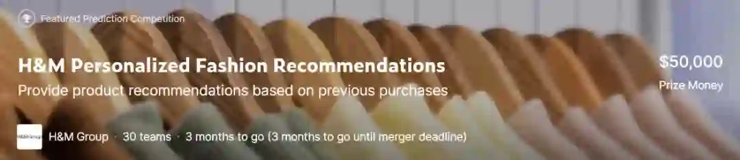 在本次比赛中,H&M 集团邀请您根据以往交易数据以及客户和产品元数据开发产品推荐。可用的元数据涵盖从简单数据(例如服装类型和客户年龄)到来自产品描述的文本数据,再到来自服装图像的图像数据。