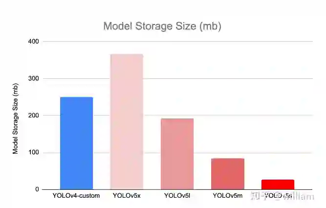 上图中不同模型的大小分别为:V5x: 367MB,V5l: 192MB,V5m: 84MB,V5s: 27MB,YOLOV4: 245 MB