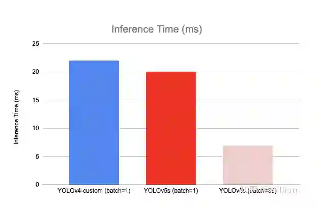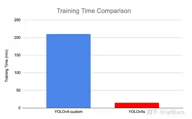 根据Roboflow的研究表明,YOLO V5的训练非常迅速,在训练速度上远超YOLO V4。对于Roboflow的自定义数据集,YOLO V4达到最大验证评估花了14个小时,而YOLO V5仅仅花了3.5个小时。
