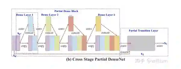 CSPNet实际上是基于Densnet的思想,复制基础层的特征映射图,通过dense block 发送副本到下一个阶段,从而将基础层的特征映射图分离出来。这样可以有效缓解梯度消失问题(通过非常深的网络很难去反推丢失信号) ,支持特征传播,鼓励网络重用特征,从而减少网络参数数量。