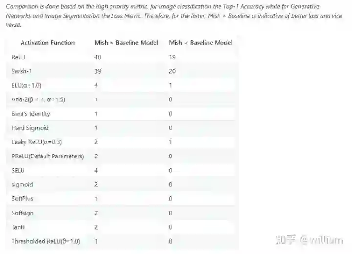 Mish在39个基准测试中击败了Swish,在40个基准测试中击败了ReLU,一些结果显示基准精度提高了3–5%。但是要注意的是,与ReLU和Swish相比,Mish激活在计算上更加昂贵。
