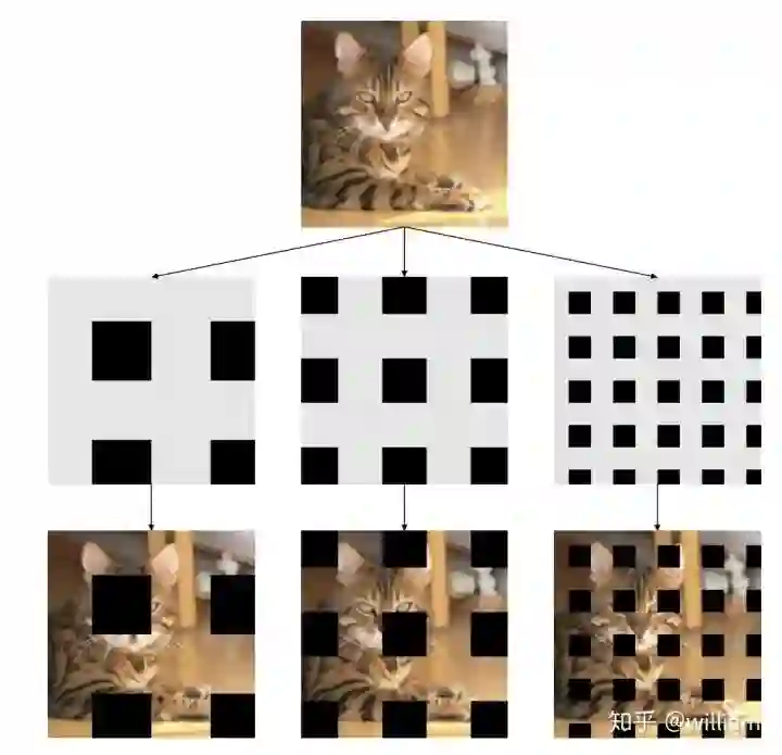 Grid Mask :将图像的区域隐藏在网格中,作用也是为了让模型学习对象的整个组成部分。