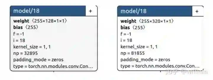 下图中左侧为YOLO V5s的模型右侧为YOLO V5x的模型,可以明显看出卷积核数量不一样,因此参数数量也不一样。