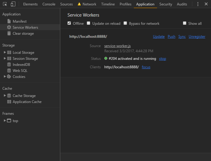 如果你认为 JavaScript 调试很苦难的话,service worker 也有趣不到哪里去。Chrome 开发者工具的Application提供了一些有用的特性,日志输出也会打印在控制台上。