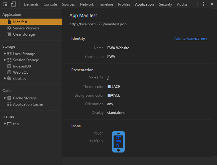 Chrome 开发工具的 Application 标签下 Manifest 区域会校验清单 JSON 并提供一个“Add to homescreen”连接,会将功能放到设备的桌面上: