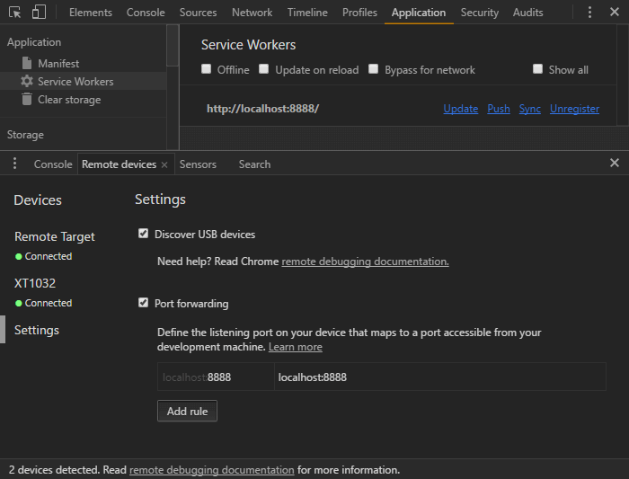 选择左侧的 Settings,然后点击 Add Rule,将 8888 转发到 localhost:8888,现在你就可以在智能手机中打开 Chrome 并导航至 。