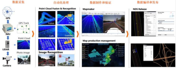 一个完整的流程是这样的:百度的高精地图采集车队行驶在全国道路上将道路上所有的标志、标识等要素以照片、激光点云、GPS 的方式采集进入自动化的预处理过程;在预处理的过程中,将集成图像识别、激光点云融合、点云识别这些 AI 算法以及 GPS 大数据挖掘,对照片、激光点云、GPS 中的车道线、护栏、路沿、交通标志、标牌、文字、箭头等信息予以提炼,输入给数据生产阶段;在数据生产过程中,将这些提取生成的要素经过一系列人工修正、质检,形成一个合格、可发布的高精地图;最后,经过自动化编译过程发布给客户。