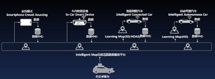 既然是“数据地图”,那么数据的采集和更新就至关重要,所以这里不得不提百度的 Intelligent Map 平台。Intelligent Map 是百度基于多源数据生态、动态更新的高精数据服务平台。该平台包含百度高精地图(Baidu HD map)、百度地图汽车版(Baidu Map for Auto)以及百度地图三类产品,三类产品的相关数据都会集成到该平台上。同时,Intelligent Map 是 Apollo 开放平台中上层功能模块的基础数据支撑,可以为 Apollo 平台的成员与合作伙伴提供数据共享,还能将他们主动回传的数据分析处理并循环应用,从而完善数据闭环,形成更为全面庞大的数据信息平台,某种意义上,这一形式类似于数据的“众包采集”。