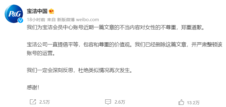 【公众号发文被指侮辱女性,宝洁道歉】近日,宝洁会员中心公众号发布文章《女人脚臭是男人的5倍,不信闻一下!》,被指文内用词具有明显侮辱性。24日宝洁官微发布声明称,为不当内容对女性的不尊重,郑重道歉。已删除该文章,会深刻反思,杜绝类似情况再次发生。(中新经纬)