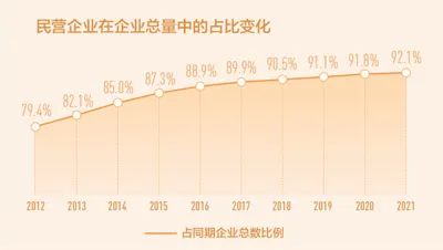 【民营企业数量10年翻两番】记者近日从国家市场监督管理总局获悉:2012―2021年,我国民营企业数量从1085.7万户增长到4457.5万户,10年间翻了两番,民营企业在企业总量中的占比由79.4%提高到92.1%,在稳定增长、促进创新、增加就业、改善民生等方面发挥了重要作用。(人民日报)