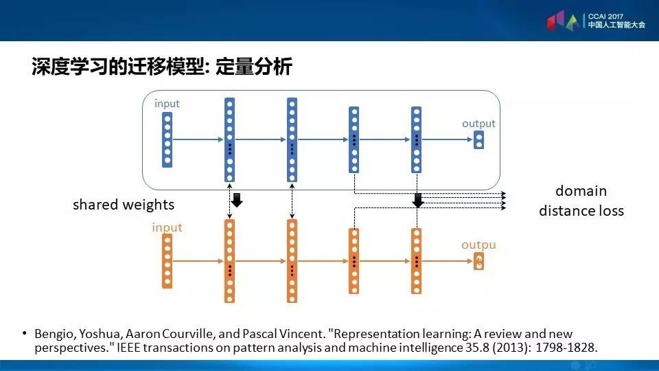 在这个里面我们可以看知识到底有多少可以从蓝色到橘色的,从源领域到目标领域,产生这样的迁移,我们可以看到中间层有很多层参数可以共享。另外层次越高的话,可能它关心的高层的概念离得越远。我们关心的是领域之间的距离,我们能否把领域之间的距离刻画出来,在深度学习的初创期,有很多启发式的做法,其实很多概念是和迁移学习不谋而合的。