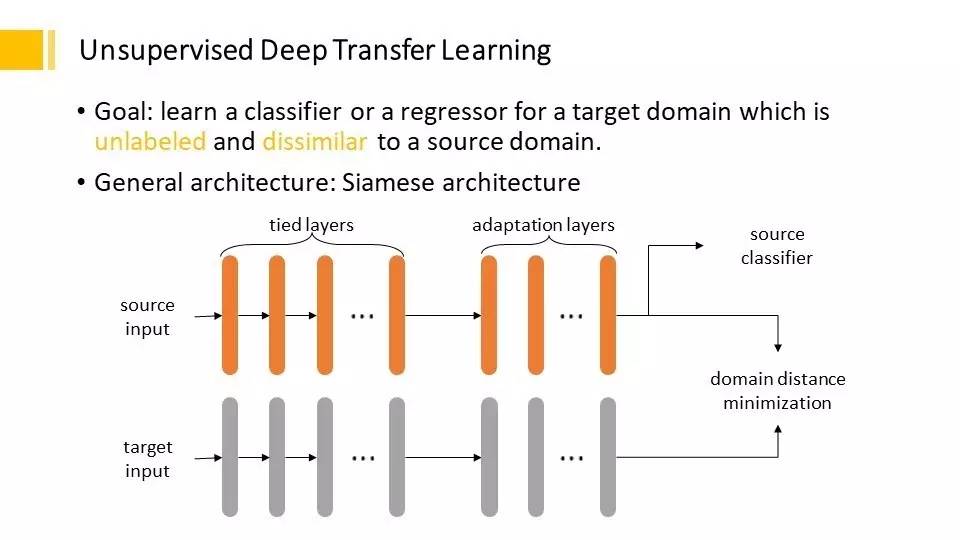 第一个是说我们在两个领域完全都没有标注的,目标和源数据都没有标注,这个时候我们就可以利用刚才的知识把下层固定住,直接迁移。在比较靠上层就可以放开,利用的方法是可以来减少两个领域之间的距离,这个距离虽然我们没有标注,我们还是可以把它衡量出来的,就像用刚才MMD的方法。