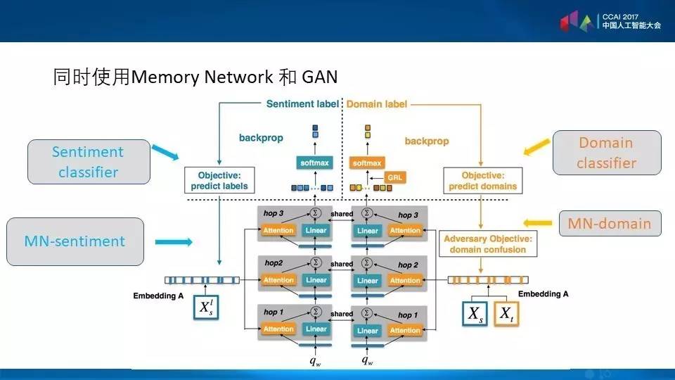 我们通过迁移学习把这个词找出来,在这里用的工具是Adversarial模型,在一堆摹本里面找出关注量比较大的词和词组,有了这一Adversarial模型,我们就可以自动打分,我们打的分数是否靠谱,可以用另外一个Domain Label的词告诉我们,什么样的词才有这样的特性呢?首先两个领域共享,能够帮助我们在新领域共同地指出舆情的趋向。同时希望模型越少越好,就是这三件事翻译成目标函数里面,就能建立模型。左边是舆情的Classifier,右边是领域的,我们同时希望领域的混淆度越大越好,同时我们希望Sentiment(舆情)的准确率越高越好,这两个之间形成博弈,就形成了GAN(生成网络)的概念,另外是多任务学习,就是两个任务共同进行,共同有一些共享。