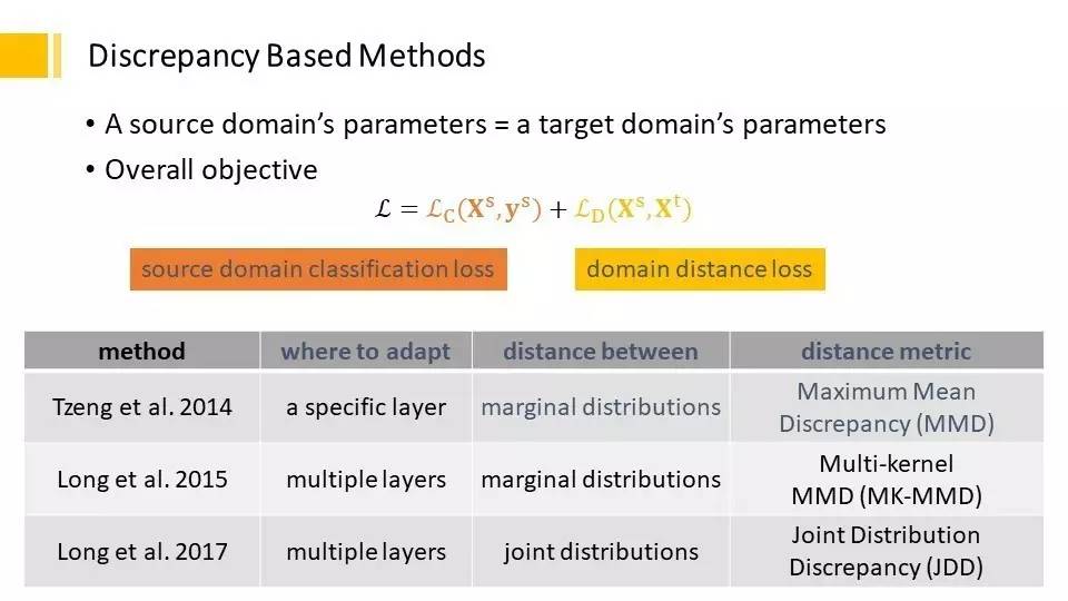 还有一个方法是就用一个Loss描述,这也有所不同,比如说两个领域之间的直接衡量,还有我们同时做两件事,第一件事是说利用两个领域之间的距离,我们要把这个距离尽量减少,同时我们让每个领域自己能够更好地表达它自己。