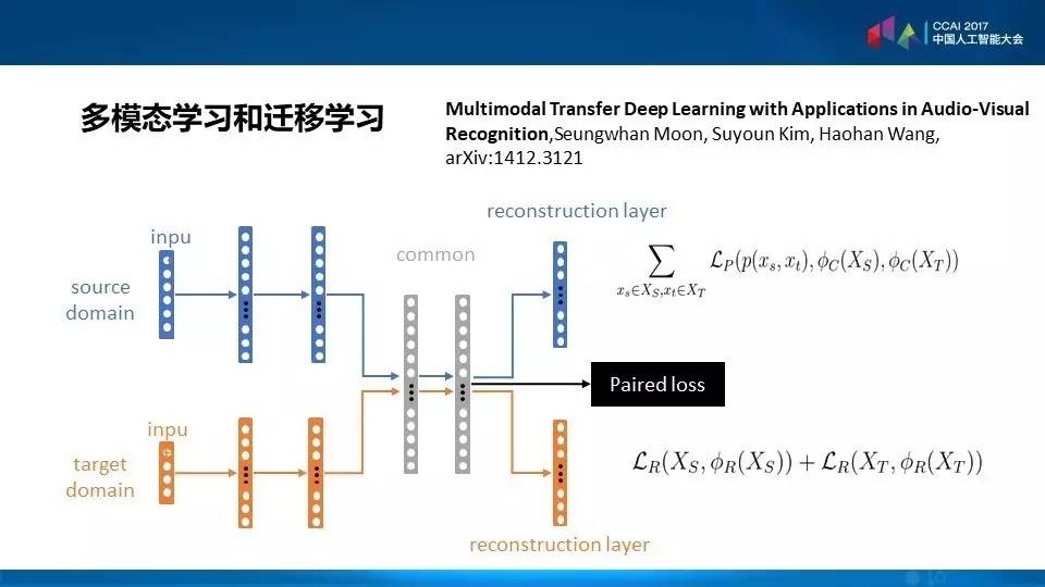 这个模型也可以发展到多模态,上面的源领域是图像,下面的可以是文字,可以让他们之间有一些层次可以分享。最后得到的系统就是既可以理解一个源领域,比如说图像可以转化为文字,又可以把文字转化成图像。另外还可以加入正则化,我们可以变化各种各样的正则,使得靠上层的层次之间互相靠拢。